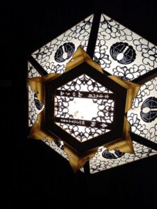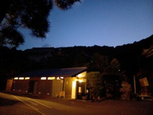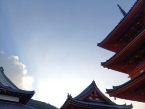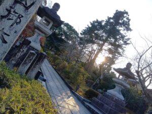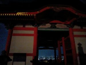 お寺の後ろの山の方に明るい陽の光が見え始め
